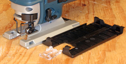I keep waiting to see if Bosch can make changing blades in their jig saws any easier but it is looking like they may have maxed out the engineering of blade changing. To make changing blades any easier Bosch might have to send a technician along with each jig saw to change the blades for you. The new plunge mechanism design goes a long way toward stabilizing the blade during the cut. Since much of this happens within the gear case we don’t have much to look at but it means that we can cut straighter easier and without the little arms that used to grip the blade on either side. Bosch also retains the roller guide at the rear of the blade to both support it against cutting pressure and to help to keep it running straight. This is a good system that works very well without needing tweaking by the operator. Tougher FootplateThe Bosch JS470EB Barrel Grip Jig Saw features a redesigned footplate that makes it tougher and easier to work with. The footplate is made from precision cast aluminum and fitted with a steel insert. Bosch says in their literature and the Bosch JS470EB Barrel Grip Jig Saw “footplate and its mount is optimized to withstand the toughest conditions and survive accidental drops intact.” Don’t look for words like that from the cheapo manufacturers. The footplate comes with a snap on plastic no-mar cover that not only prevents marking of the wood but also lets the Bosch JS470EB Barrel Grip Jig Saw slide along very easily. It also includes a snap-in plastic zero clearance plate for use when cutting fragile woods that tend to splinter or chip along a cut. Combined with the orbit control this insert can help make exceptionally clean cuts for a jig saw.