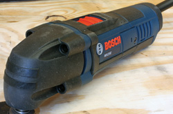 Bosch MX25EK-21 Multi-X Oscillating Tool KitA versatile tool and a plethora (bunch) of attachments!Text, photos and video by Tom Hintz Posted - 4-12-2011 For a long time there was really only one game in town when it came a quality, hand-held oscillating tool. Everyone knew that market-cornering singularity could not go on forever and sure enough, here comes Bosch with their Bosch MX25EK-21 Multi-X Oscillating Tool complete with the imprint of their world-class engineering and manufacturing capacities. The oscillating tool world will be a one horse race no more. The BasicsThe Bosch MX25EK-21 Multi-X Oscillating Tool is a handheld 120V-powered oscillating tool that uses a multitude of cutting, sanding and grinding attachments made by Bosch and others. What makes these tools effective is moving those attachments through a small arc very quickly. I know that sounds simple enough but making that motion at the speeds that the Bosch MX25EK-21 Multi-X Oscillating Tool is capable of and doing that reliably borders on a miracle. Consider that the Bosch MX25EK-21 Multi-X Oscillating Tool moves the attachments through a 2.8-degree arc, 1.4-degrees left and right. To make the attachments effective they cycle through that arc 8000 to 20000 times per minute. Try that with your sanding block!