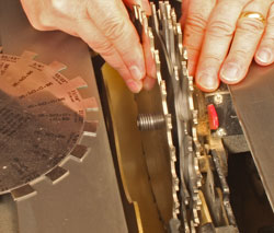 Infinity Tools Dado Measuring GaugeSetting up stacked dados just got as easy as it should beText, photos and video by Tom Hintz Posted - 1-26-2009 On a good day setting up a stacked dado set used to be a trial and error proposition for most of us. The varying thickness of the wood we use doesn't help the task either. Now, the Infinity Tools Dado Measuring Gauge makes this process easier and faster. A test cut remains a smart idea but the simplicity of the Infinity Tools Dado Measuring Gauge makes this a far more enjoyable (and accurate) woodworking task. What It IsThe Infinity Tools Dado Measuring Gauge is a round, 8"-diameter plate, made from high end table saw blade steel. It has 19 laser cut notches around its edge sized from 1/4" to 29/32". That range should cover or exceed the capability of all stacked dado sets this side of the industrial community. The Infinity Tools Dado Measuring Gauge also has a 5/8"-diameter center hole so you can store it on a hook or in your stacked dado set box so it can be found when you need it.