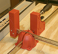The Bench Dogs may sound “old school” but the innovative two-piece design fits the modern woodworking shop very well. Many higher end commercially produced benches have holes in them that will fit the JET Bench Dogs. The Bench Dogs have an outside diameter of 23/32”, allowing them to drop into hand-drilled ¾”-diameter holes easily. If you have to make several similarly sized doors or frames, a simple but accurate jig can be made from a sheet of ¾”-thick MDF or plywood. Being able to combine the Cross Doc™ Framing Blocks and Bench Dogs is an even better idea that further extends the possibilities. I made a simple, easy to store clamping board from a 2-foot by 4-foot piece of ¾”-thick Lauan plywood. After drawing a simple, square grid representing the major clamping schemes I could think of, I drilled ¾”-diameter through holes with a hand-held drill at the intersections. Adding task-specific patterns later is easy because the clamping range of each JET Parallel Jaw Clamps allows one pattern to handle a wide range of project sizes. The reversible clamping head may not be needed frequently but can save the day when the situation arises. The precise fit of the mechanism plates that lock the sliding head well also make reversing the head a little difficult. I found that standing the clamp on end, fixed jaw down lets you look down through the clamping head to guide the bar as you feed it through the locking mechanism. Hold a little pressure on the release trigger and the process is actually pretty easy. The JET Parallel Jaw Clamps are very easy to use. All of the features described earlier make clamping wood square and with the right amount of pressure very easy. Quite simply, the JET Parallel Jaw Clamps work better than any similar clamps I have tried. ConclusionsClamps are some of the most important tools in woodworking and can have a major impact on your projects. Spending the extra dollars to get good ones the first time around will undoubtedly save money in the not so distant future. At this writing (12-2-2006) the 12-Piece JET Parallel Jaw Framing Clamp Kit featured in this review is in short supply but that should change soon. Individual JET Parallel Jaw Clamps (sometimes packaged in pairs) in lengths from 12” to 98” lengths with street prices ranging from $35.35 to $66.50 each. (12-2-2006) That combination of quality, innovative design and price make the JET Parallel Jaw Clamps a very good investment made even better by the lifetime warrantee that covers them. Have a comment on this review? - Email Me!