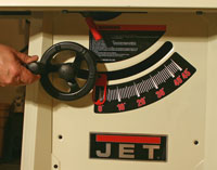 Miter GaugeThe JET ProShop Saw comes with a full-featured miter gauge that swivels to 60-degrees to either side with adjustable stops at 0 and 45-degrees. A large, comfortable handle both locks the fence and provides a safe grip for pushing the wood. The guide bar has a disk at the tip to follow the T-shaped miter slots. The guide bar also has expansion adjusters with which to fine-tune its width to the miter slot to eliminate side to side play. In the ShopThe overall fit and finish on the JET ProShop Saw is very well done. The table surface is finely ground and with a coat of paste wax (or your favorite table preparation) allows wood to slide easily and predictably. The miter slots are consistent in width and parallel to each other.