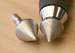 The 220-grit (left) and 600-grit (right) diamond encrusted cones combine to make short work of touching up your moritser chisels.