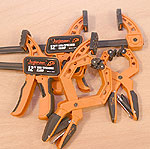 What is really nice about this system is that the release works very easily, making one-handed operation simple and predictable. In many cases, you can actually loosen the grip of the clamp to reposition it without it jumping fully open. The locking mechanism is mechanically very simple and appears totally unaffected by dust. Despite trying to apply too much or too little pressure, the Pony Hand clamp locking mechanism remained solid and predictable. In the ShopThis will be one of the shorter "In the Shop" sections of my reviews because the Jorgensen Cabinet Master clamps and Pony Hand clamps performed exactly as advertised in every situation I could think of. From the moment they arrived in the shop, I have been using them for all clamping within their capacities. In every case, both of these clamp styles held fast, showed no deflection, slipping, sticking or marking of the wood. Both released easily for repositioning and made one-handed operation easier than with any similar clamp designs I have used. I have several types of similar clamps, all of which remain hanging on my clamp rack, unused since the Jorgensen and Pony versions arrived. The contact pads on the Jorgensen and Pony clamps grip tightly, do not slip and have not left a visible mark on any wood they have been used on. The swivel feature on the hand clamps makes securing pieces of wood or jigs to a surface easy even if you do not have them perfectly aligned with the surfaces. Simply put, the Jorgensen Bar Clamps and Pony Hand Clamps perform perfectly with no surprises other than how tightly they grip and how easily they release. I can live with that kind of surprise in clamps. ConclusionsAll of us need clamps, usually more than we have. The Jorgensen ISD Bar Clamps are available in 6”, 12”, 18”, 24” and 36” lengths with street prices ranging from $17.99 for the 6” to $26.99 (12-15-2005) for the 36”-long model. The Pony ISD Hand Clamps come in 1 ½”, 2 ¼” and 4” jaw capacities with prices ranging from $2.99 for the 1 ½” version to $6.49 (12-15-2005) for 4" model. At theses prices, you can equip your shop with the best on a so-so budget. Uncommon quality and function for common prices. Who would have thunk it! Visit the Adjustable Clamp web site. Do you have a comment on this review? – Email Me!