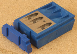 The drilling block has three specially spaced drilling guides that make it easy to align virtually any width work piece for drilling one or more holes accurately and in the best arrangement. Each of the drilling holes has a special metal liner that guides the stepped drill bit to insure the proper angle on the pocket hole and prevents wandering that could deform the hole. The Kreg K4 Jig Kit includes a spacer block that slips onto the bottom of the drilling block. If you align the end of the drilling block (no spacer) with the edge of the wood, the pocket hole is placed for 1/2"-thick material. Add the included spacer block and align its bottom with the edge of the wood and the hole is located for 3/4"-thick material. Additional spacer blocks (available as an accessory) can be added with each additional spacer increasing the compatible wood thickness by 1/4".