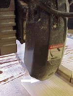 Setting up the anti-kickback features (left) on my radial arm saw takes only seconds. In some cases they actually help produce better cuts, in the wood, not your hands. I learned the hard way that getting the chip shield (right) as low as possible helps when pieces of knots are launched by the blade!