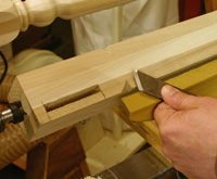 A story stick is nothing more than a strip of wood or other stiff material cut to the same length as the blank with the major transitions (high and low spots) marked on it. Many, myself included, draw a loose representation of the corresponding shapes above the marks on the story sticks. Some take the time to make an accurate scale drawing of the profile. This drawn shape helps when turning the first piece but its value is limited on the remaining copies. As described later in this article, we use the first completed turning as a visual sample for those that follow. Using the story stick, you can accurately (and quickly) apply marks to all of the blanks so that major points of reference are cut in exactly the same positions on each piece. This alone helps a great deal in turning identical looking pieces. If you might be making more than one set of legs, the story stick is even more valuable. Square to RoundThe first transition is an important one. Many table legs have a square section at the top though some have another square section near the bottom as well, particularly when stretchers between the legs are used. The transition from square to round requires rounding the corners that lead to the rounded sections. The easiest way to accomplish this without chipping is to mark this transition on all four corners and use a small hand saw (a dovetail saw works well) to make preliminary cuts. The maximum depth of these cuts depends on the diameter of the round portion where it ends. However, I have found little benefit of making these cuts deeper than 3/8” to ½”.