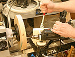After gluing up the seat blank and rough-cutting the circle to 12 ½" in diameter, I used a compass to draw a 6"-diameter circle at the center of the best looking side. The faceplate was attached to this side first, using double-sided tape only because this would become the top of the seat. The faceplate was then spun onto the spindle, the tailstock brought up and the live center tightened against the center of the blank as further security.